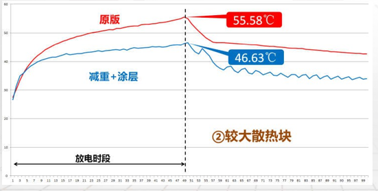 同时,NIRC涂层还显著提升了逆变器的散热性能。测试数据显示,采用NIRC涂层后,使用NIRC涂层的逆变器重量减轻,且最高温度为46.63℃,未涂层的逆变器最高温度为55.58℃。逆变器的降温性能提升近16%,最高温度明显降低,且散热效果更显著。这得益于NIRC出色的热传导性能,能够有效将逆变器内部产生的热量快速导出,大幅改善了其热管理。